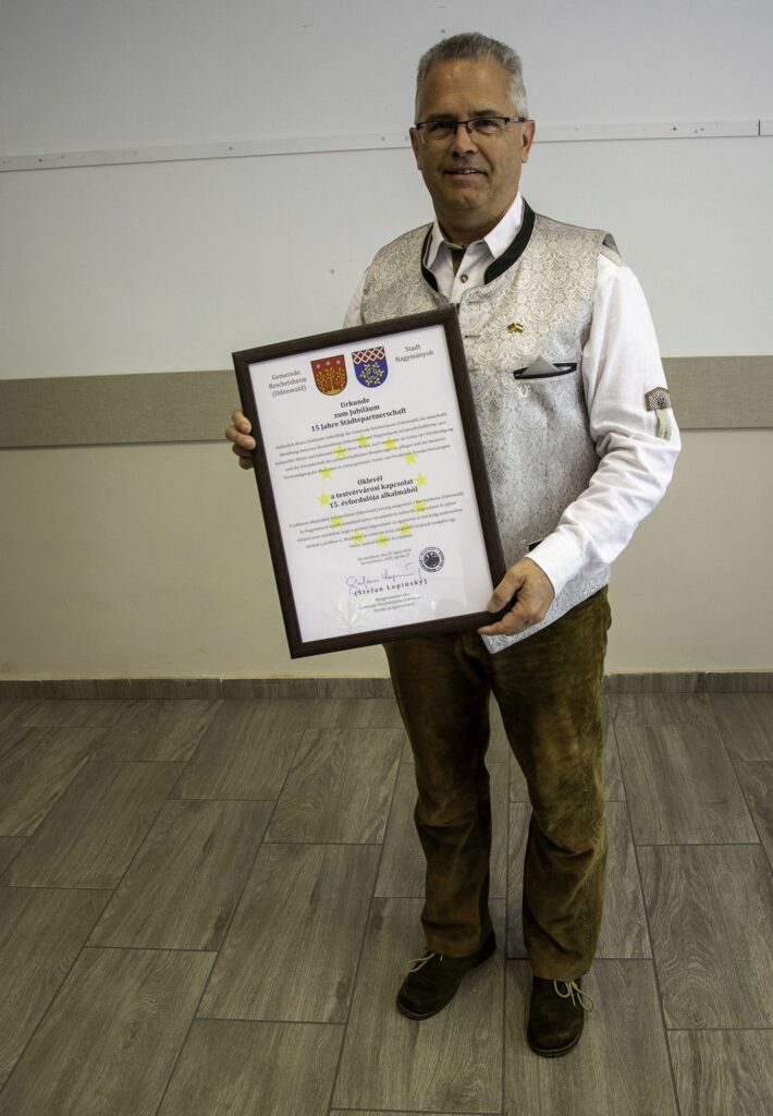 Die Grußworte von Jochen Rietdorf (für die Gemeinde Reichelsheim), Béla Hucker (für den Verschwisterungsverein Nagymányok), Georg Hörr (für den Verschwisterungsverein Reichelsheim) und Iris Kriegbaum (für den Obst- und Gartenbauverein) zeichneten die Entwicklung von den Anfängen bis hin zur Städtepartnerschaft und die Freude über die stabile und sehr aktive Ausgestaltung der lebendigen Freundschaft auf.
