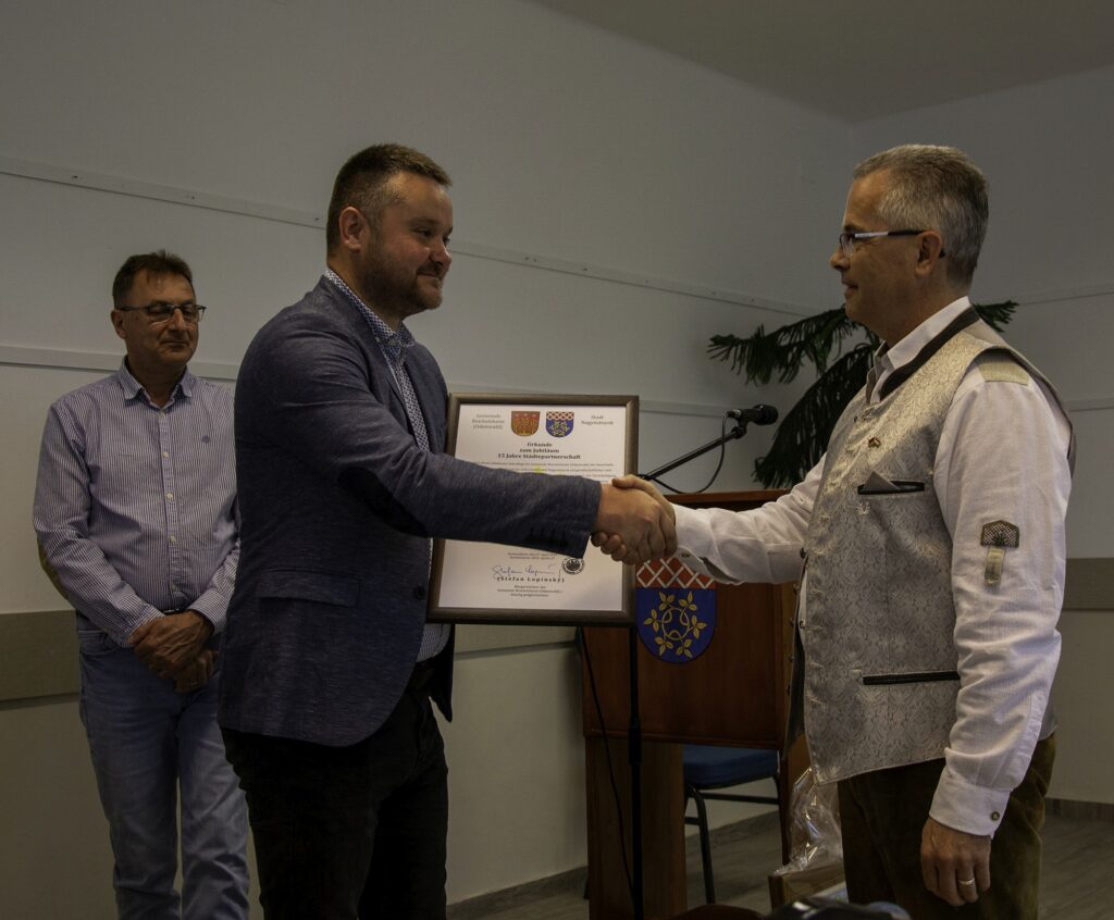 Frau Nikolett Miklós übersetzte die Beiträge gekonnt, sodass es für alle verständlich wurde. Zwischen den Grußworten sorgten die Kinder des Kindergartens, eine Klasse der Grundschule und der Chor „Glück auf“ mit ihren großartigen Beiträgen für Kurzweil, bevor die Gastgeschenke gegenseitig ausgetauscht wurden.